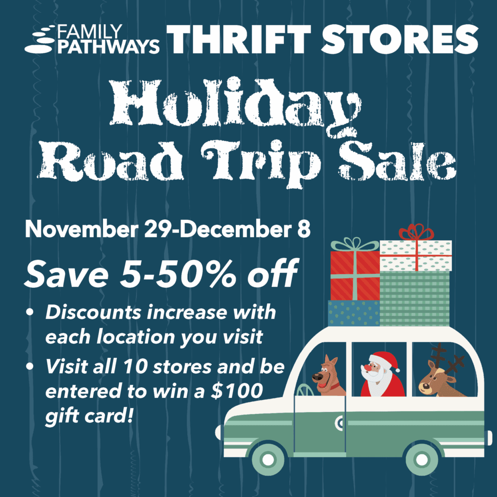 Family Pathways Thrift Stores is gearing up for the Annual Holiday Road Trip Sale, happening Friday, November 28 – Sunday, December 7 at all 10 store locations.
